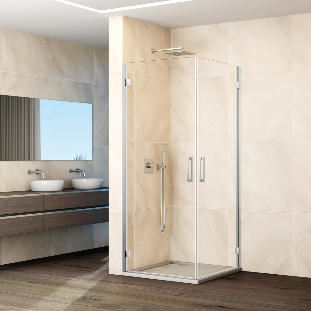 Mampara de ducha angular compuesta por 2 puertas abatibles con bisagras a pared o a perfil con cierre imán, perfilería en aluminio con cristales templados de 6mm y tratamiento antical. Diseño minimalista actual sin perfilería inferior. Medidas a elegir. Entrega inmediata.