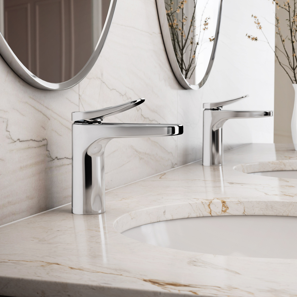 Grifo monomando fabricado en latón cromado con diseño moderno sin florón, de curvas redondeadas y maneta integrada minimalista con diseño curvo.