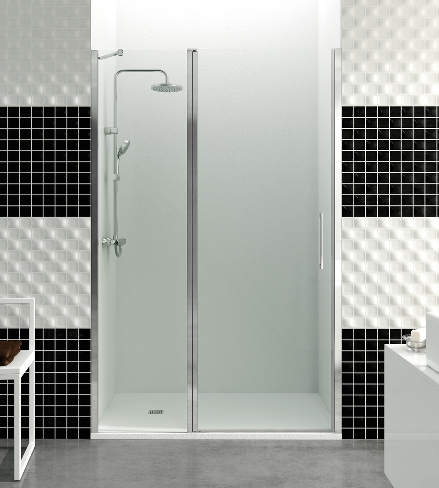 Mampara de ducha frontal con panel fijo más puerta abatible con cierre perfil imán, perfilería en aluminio con cristales templados de 6mm y tratamiento antical. Diseño minimalista actual sin perfilería inferior. Medidas a elegir. Entrega inmediata.