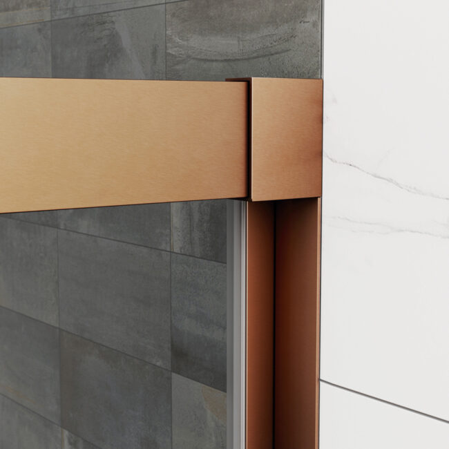 Perfil de pared de 4cm fabricado en aluminio acabado cobre cepillado PVD. Usado en modelo Basic en susitución del perfil estándar permite conseguir un rango 1,5cm superior. También utilizado como perfil para laterales fijos Glass/Open.