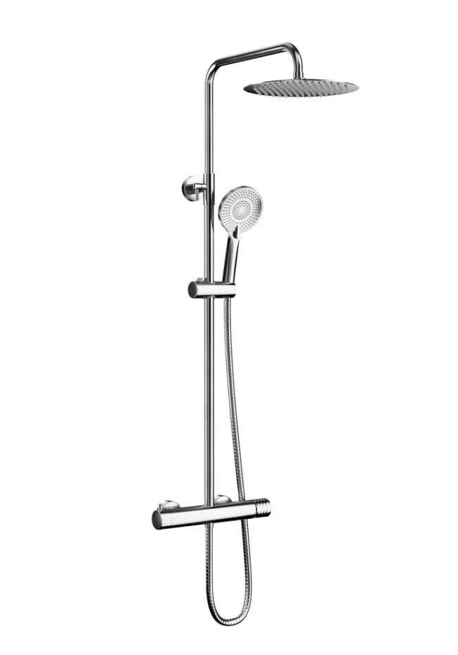 Ducha vista monomando redonda con cuerpo de grifería en latón cromado y barra de acero inoxidable, rociador extraplano de 25cm y desviador integrado en la grifería.