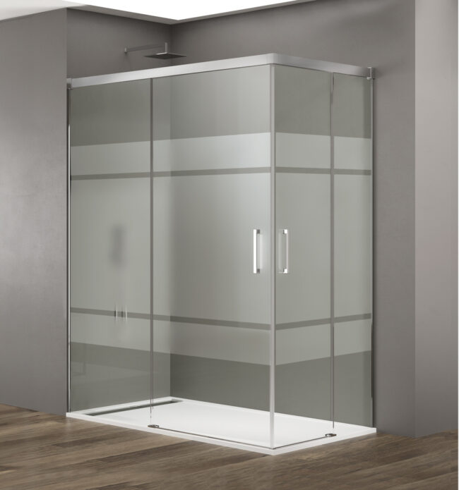 Mampara de ducha compuesta por 2 fijos + 2 correderas angular fabricada en aluminio con cristales templados de 6mm. Ausencia de perfilería inferior y superior, dando total protagonismo al cristal gracias a sus rodamientos integrados. Disponible en cromo, negro y oro cepillado.