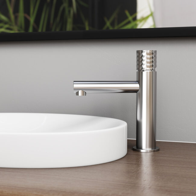 Grifo monomando redondeado con caño recto, diseño elegante y funcional y maneta vanguardista de diamante, cartucho de apertura en frío de 25mm y limitador de caudal ecológico.
