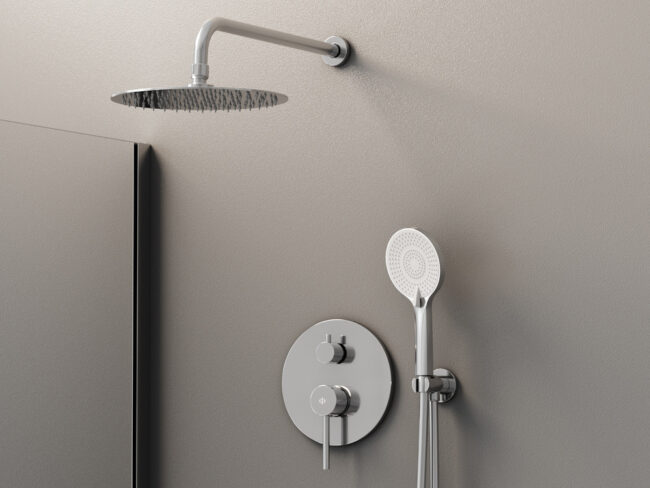 Conjunto completo empotrable redondo para ducha fabricado en latón, con caja de registro, disponible en formato monomando y termostático y acabados cromado y negro mate. Rociador y brazo incluido.