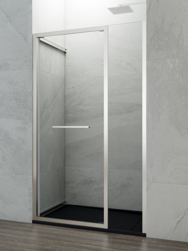 Mampara de ducha frontal fijo + puerta para espacios reducidos fabricada en aluminio con cristales templados de 6mm. Sus rodamientos orientables permiten una apertura completa de la puerta deslizando por el rail lateral. Disponible en cromo y en negro. Entrega inmediata.