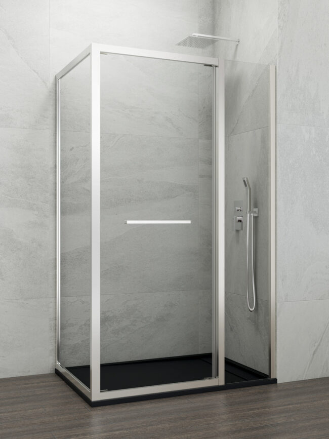 Mampara de ducha frontal fijo + puerta + lateral fijo para espacios reducidos fabricada en aluminio con cristales templados de 6mm. Sus rodamientos orientables permiten una apertura completa de la puerta deslizando por el rail lateral. Disponible en cromo y en negro. Entrega inmediata.