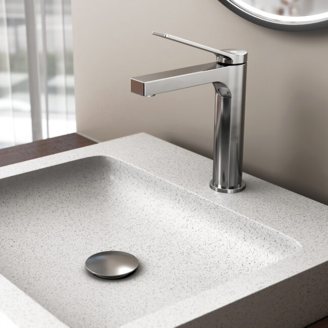 Grifo monomando fabricado en latón cromado con un diseño elegante e innovador y cartucho integrado en la maneta. Disponible en todos los formatos en entrega inmediata.