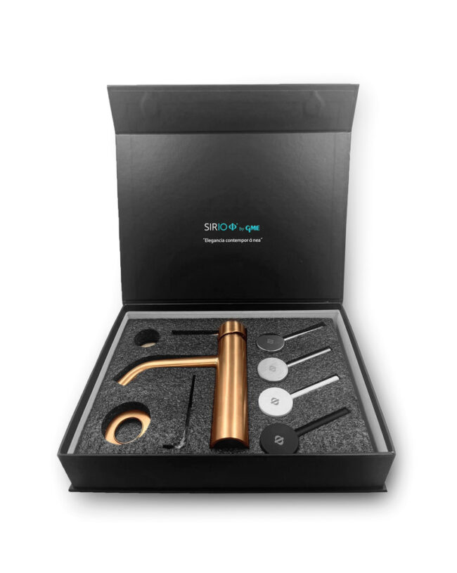 Muestrario de colores grifería Sirio. Incluye un cuerpo de grifería en oro y una maneta de cada color.