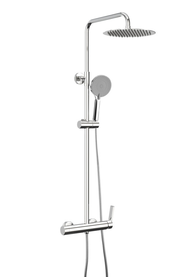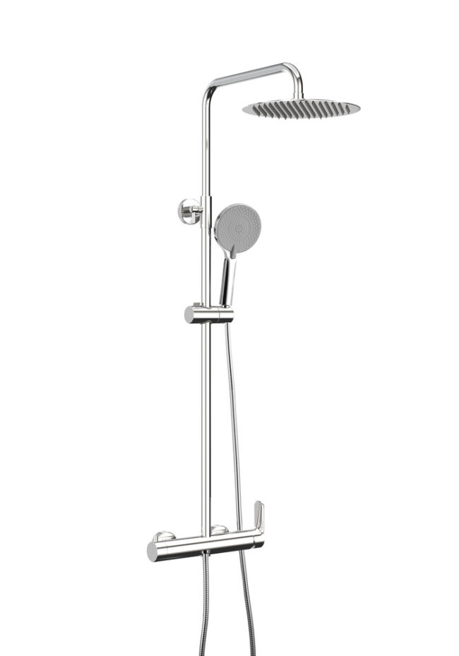 Ducha vista monomando con cuerpo de grifería en latón cromado y barra de acero inoxidable, rociador extraplano de 25cm, desviador integrado en la grifería y soporte regulable en altura. Maneta Rhio
