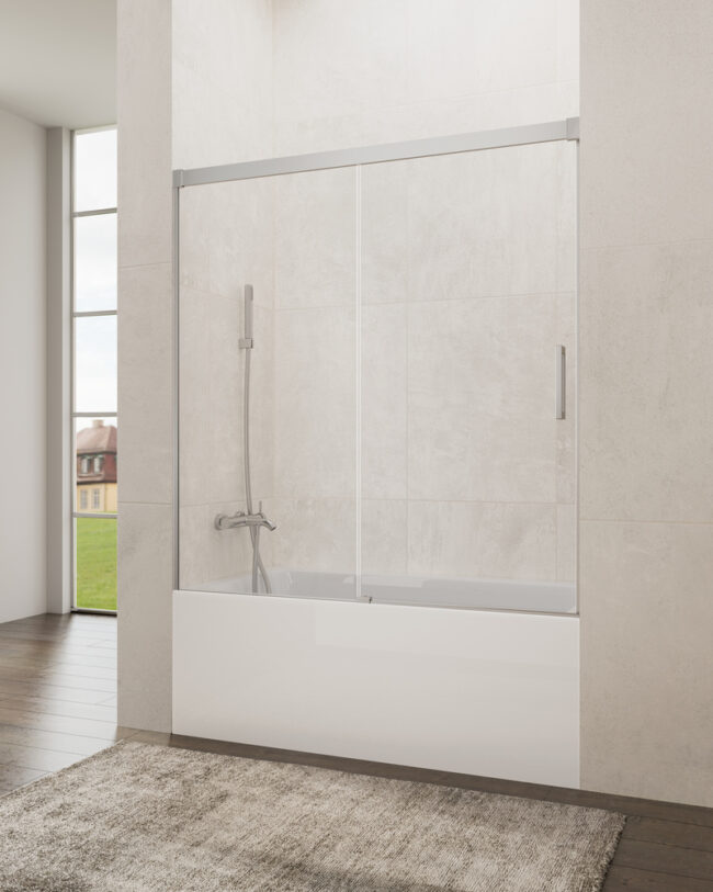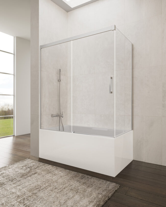 Mampara de bañera angular compuesta por un lado frontal con puerta corredera y un lateral fijo, perfilería minimalista de aluminio con cristales templados de 6mm y fijo de 8mm y tratamiento antical. Doble rodamiento en nylon silencioso con diseño actual sin perfilería inferior. Medidas a elegir. Entrega inmediata.
