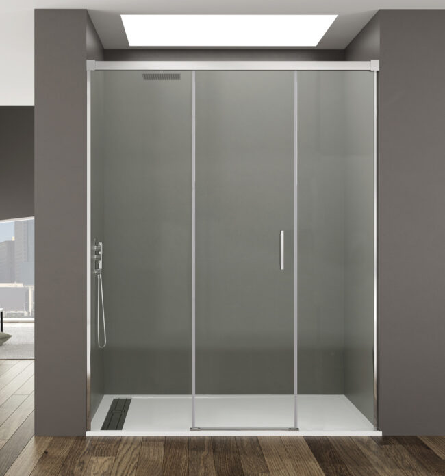 Mampara modelo Basic configurable para formato fijo + puerta corredera + fijo en distintas medidas y colores.