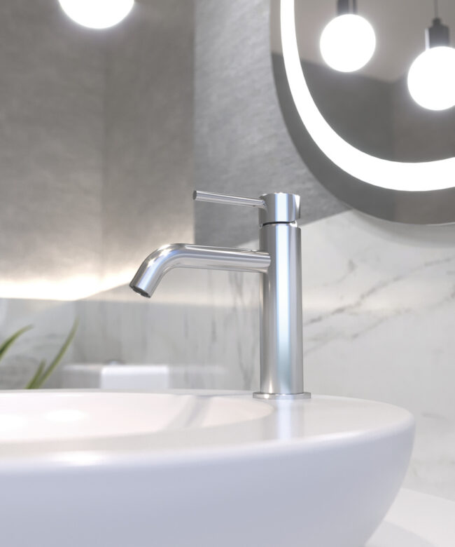 Grifo monomando fabricado en latón cromado con diseño contemporáneo elegante de curvas redondeadas y caño fino.