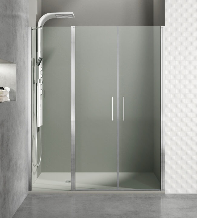 Serie Open combi J compuesta por fijo + puerta + puerta con cierre central puerta-puerta imán, configurable con paneles y puertas de distintas medidas, colores y acabados. Entrega inmediata.