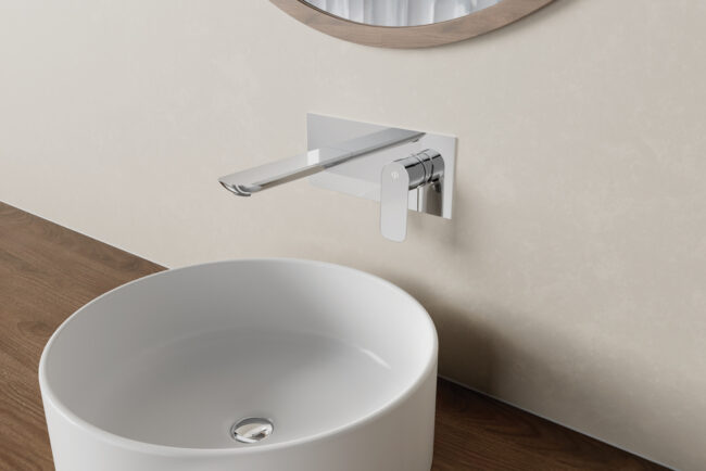 Grifo empotrable monomando para lavabo fabricado en latón con un diseño que combina elegante líneas rectas y redondeadas con un toque funcional. Disponible en acabados cromo y negro.