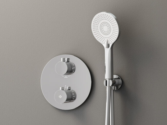 Conjunto empotrable redondo para ducha fabricado en latón, con caja de registro, disponible en formato monomando y termostático y acabados cromado y negro mate. No incluye rociador.