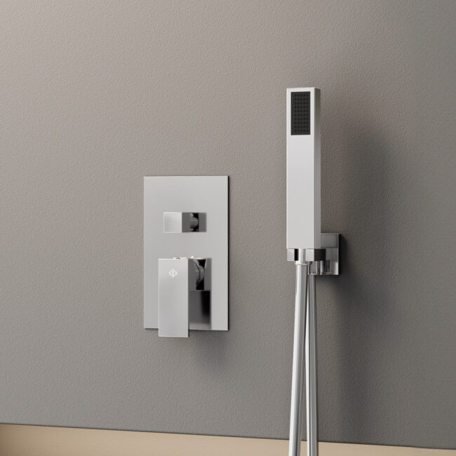Conjunto empotrable cuadrado para ducha fabricado en latón, con caja de registro, disponible en formato monomando y termostático y acabados cromado y negro mate. No incluye rociador.