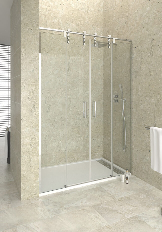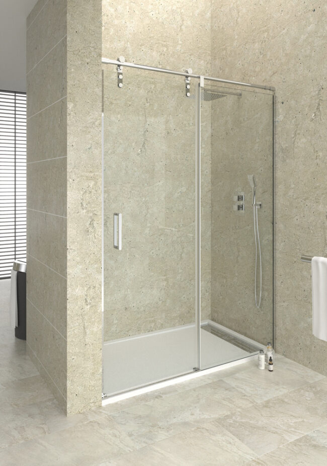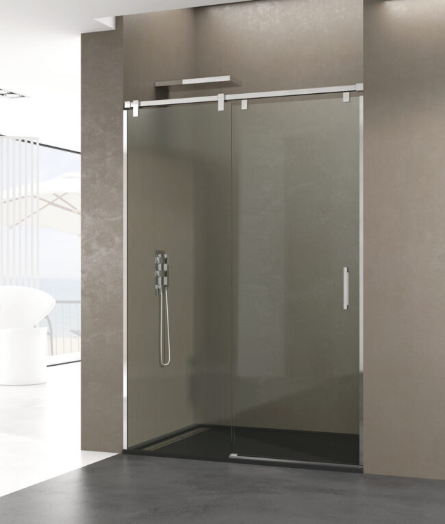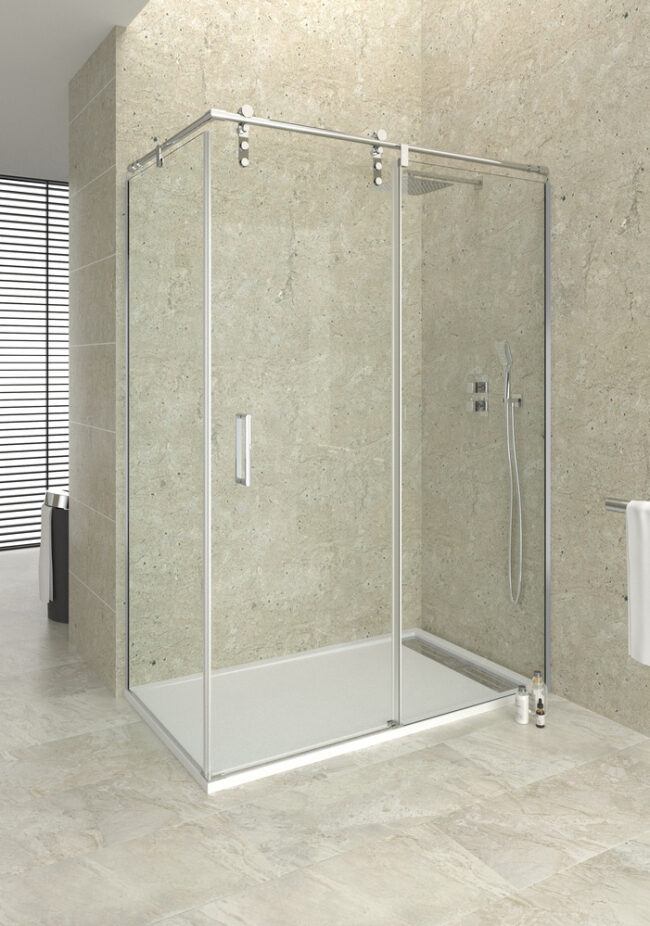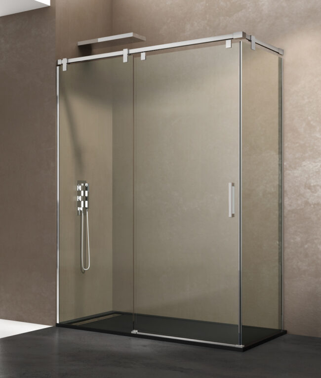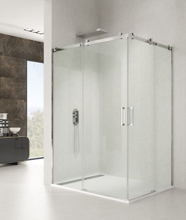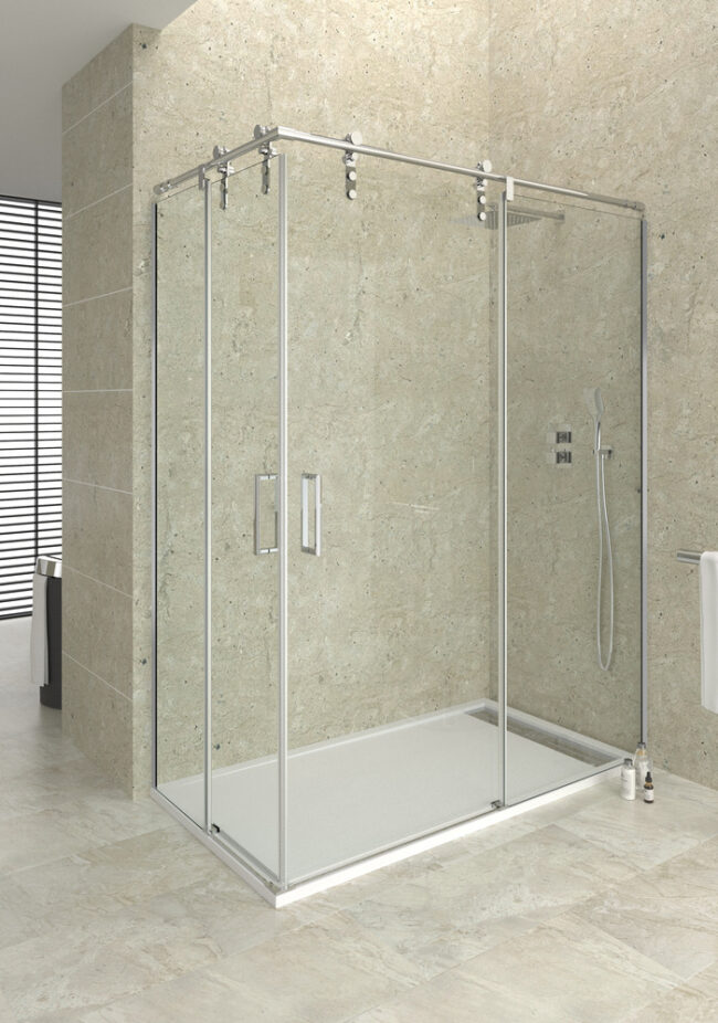 Mampara de ducha angular de diseño clásico fabricada en acero inoxidable con puerta corredera más lateral fijo, elegante barra circular de acero por la que deslizan sus rodamientos y cristales de 8mm con tratamiento antical. Todos sus accesorios en acero inoxidable pulido brillo. Entrega inmediata.