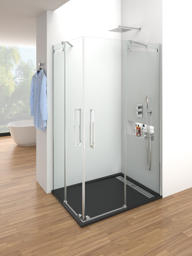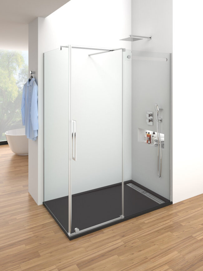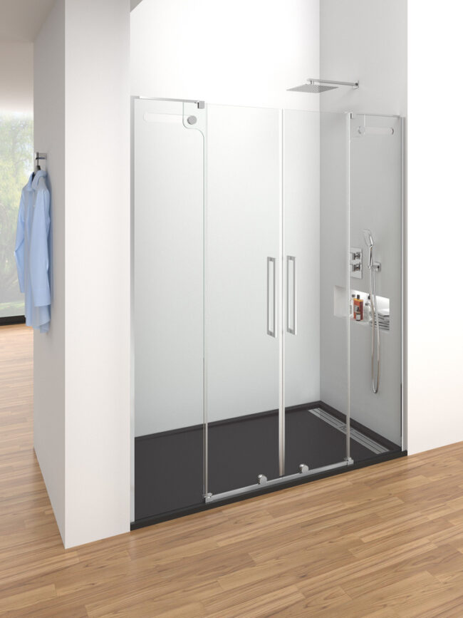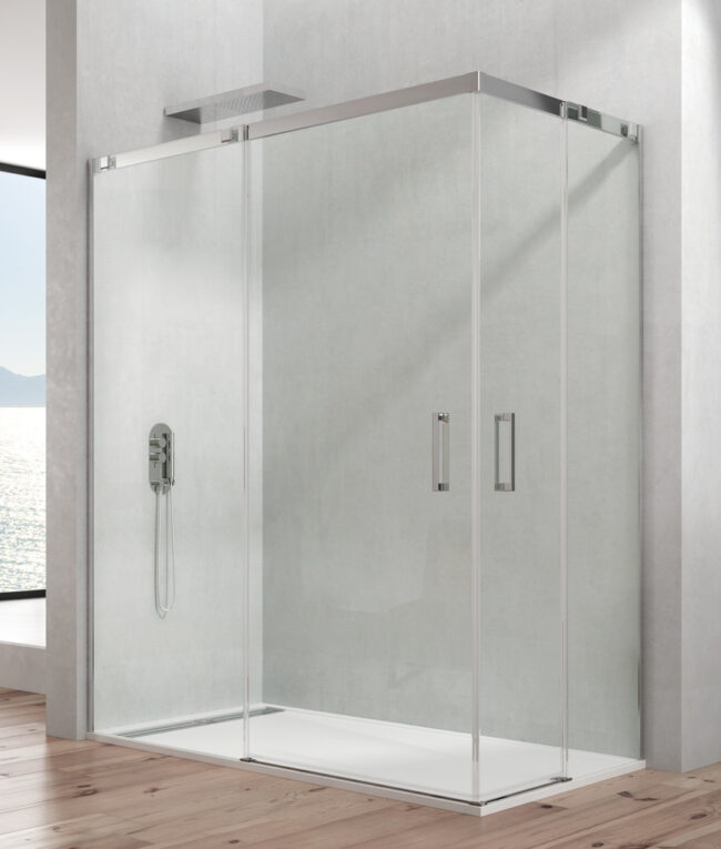 Mampara de ducha frontal con puerta corredera, perfilería minimalista en acero inoxidable pulido brillo, con cristales templados de 6mm y tratamiento antical. Doble rodamiento en nylon silencioso con diseño actual sin perfileria inferior. Medidas a elegir. Entrega inmediata.